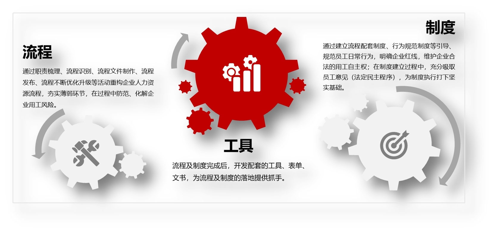 用工风险表面是法律问题,本质是企业管理问题,具有相当的复杂程度。用工风险问题必须做到提前预防方能防止企业损失。如何预防?青牛咨询旗下和平鸽企业用工风险管控咨询事业部结合为多家企业提供服务的基础上,创造性的提出“用工风险三板斧”防控体系,即:从流程、制度、工具三大逻辑出发构建人力资源管理体系,帮助企业完成初始化,并在后续的发展中持续升级,从根本上提升企业组织能力。